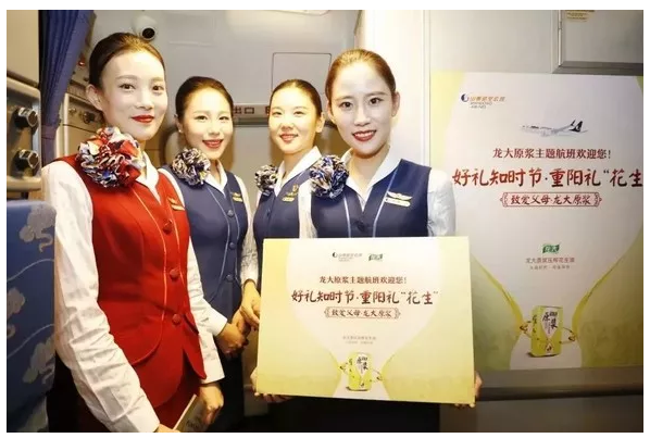 2018年10月17日,即農(nóng)歷九月初九,在SC4698西安—青島的航班上,龍大糧油攜手山東航空打造了一場(chǎng)共賀重陽(yáng)的“好禮知時(shí)節(jié) 重陽(yáng)禮‘花生’”主題航班,精心為消費(fèi)者準(zhǔn)備了一份“油”愛(ài)的禮物,讓人們帶著愛(ài)回家。