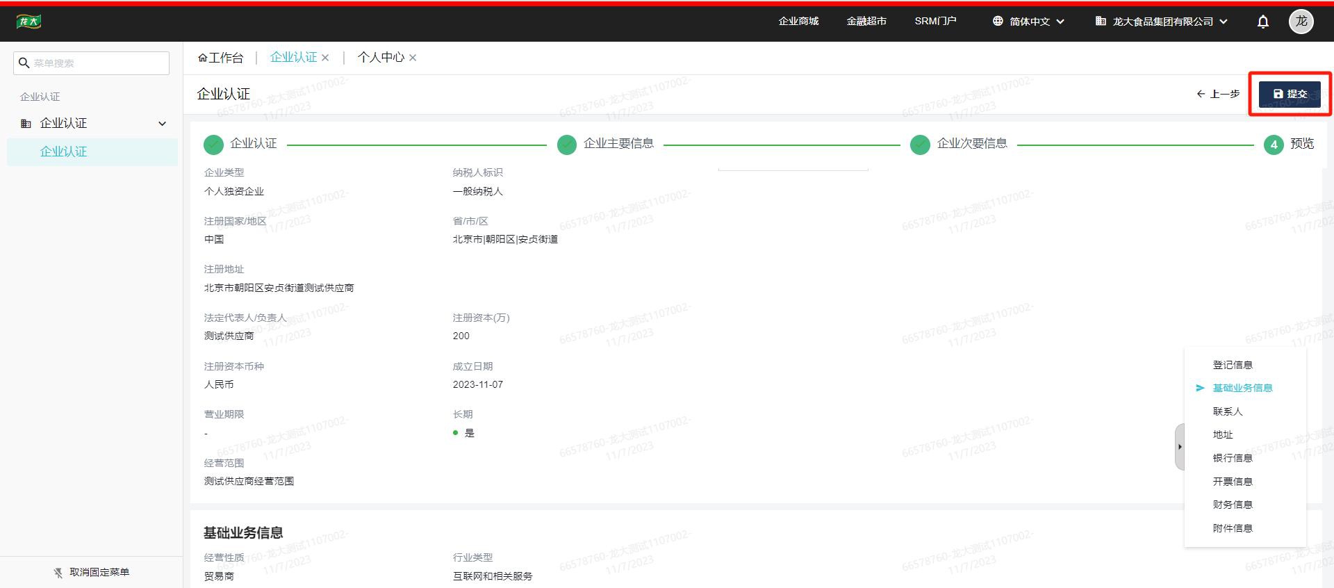 4、企業(yè)驗(yàn)證通過后,依次填寫企業(yè)主要信息、企業(yè)次要信息、預(yù)覽檢查無誤后,點(diǎn)擊右上角提交認(rèn)證審核。注冊(cè)認(rèn)證過程中如遇問題,可聯(lián)系甄云客服:400-116-0808解決,或與業(yè)務(wù)對(duì)接人聯(lián)系。