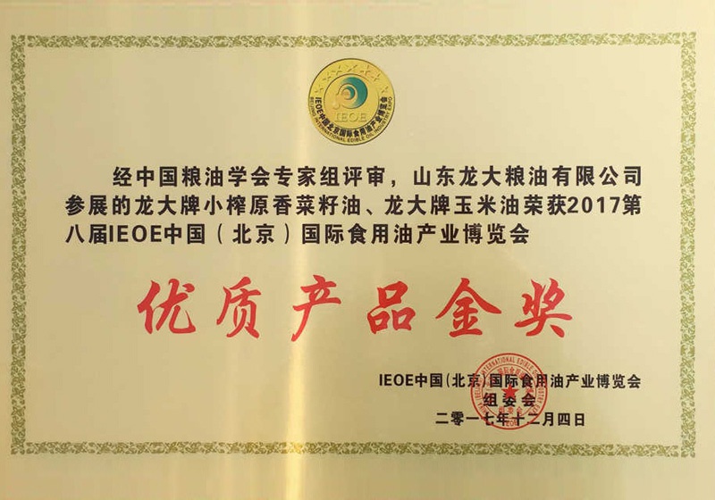 12月4日,第八屆IEOE中國國際食用油產(chǎn)業(yè)博覽會在北京盛大開幕。山東龍大糧油有限公司生產(chǎn)的龍大牌小榨原香菜籽油和龍大牌玉米油憑借過硬的品質(zhì)獲得“優(yōu)質(zhì)產(chǎn)品金獎”殊榮。